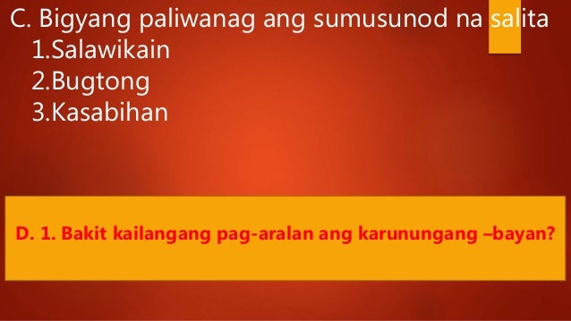 Ang mga ibang kasabihan ay naging bahagi na ng ating kulturang pangwika lalo na yong mga sinulat at binigkas ng mga dakila nating mga bayani at mga batikang manunulat. Nilalaman itago 1Deskripsyon 2Mga Kilalang Diyos 3Pagsamba sa mga Ispirito 4Mga Tagapanguna. Ang gumagawa ng kabutihan hindi matatakot sa.