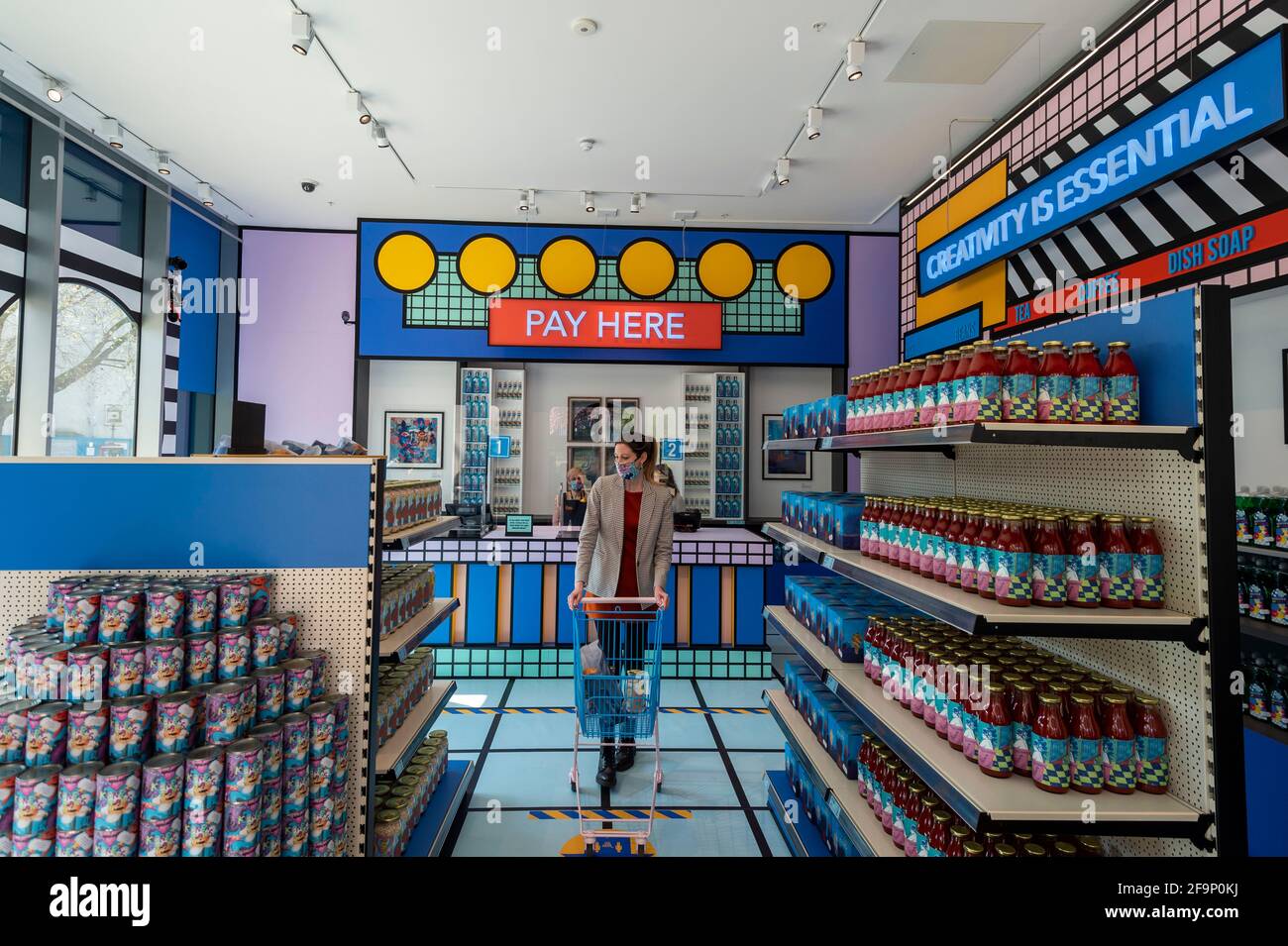 London Uk 20 April 2021 A Staff Member Poses At The Reopening Of The Design Museum S Shop In Kensington High Street Which Is Marked By A Pop Up Supermarket Wrapped In Designer Camille